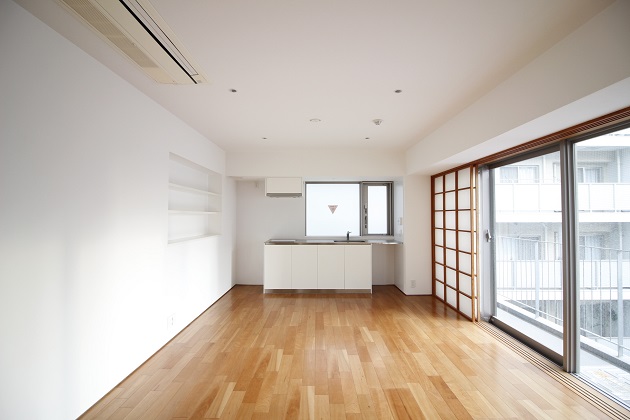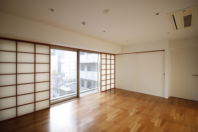 メインルームは広々した長方形、奥にもう1室ある1LDKタイプ。窓際には襖があり風情を感じる空間に。