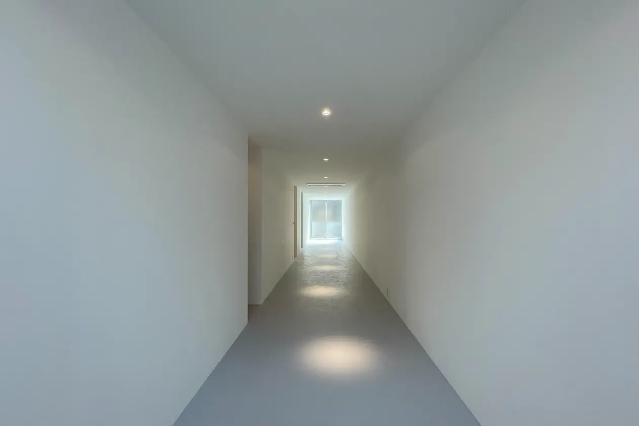 玄関は2階から。モルタル仕上げの階段を上り、白に囲まれた空間へ吸い込まれていきます。