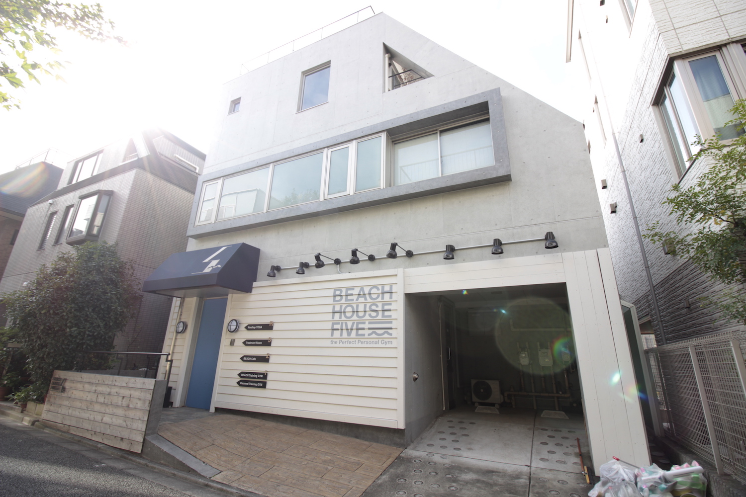 外観にもヨガスタジオ当時の名残が残ります、元々はコンクリート打ち放しのファサード。現在の板張りの外装については撤去も残置物扱いも可能となる。
