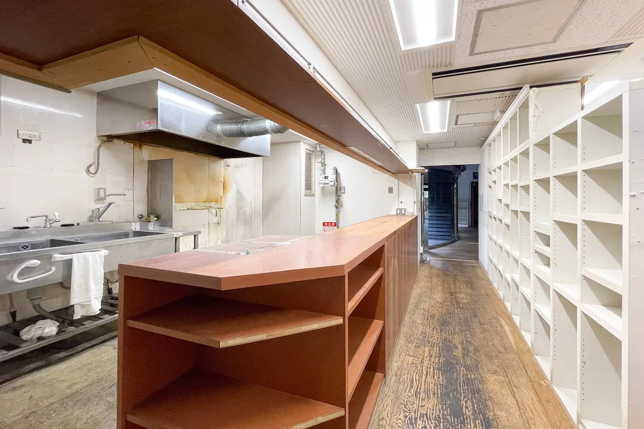 飲食店向け厨房設備が残る居抜き仕様のカウンターエリア。大きなシンクや作業スペースが確保され、調理や仕込みも快適です。