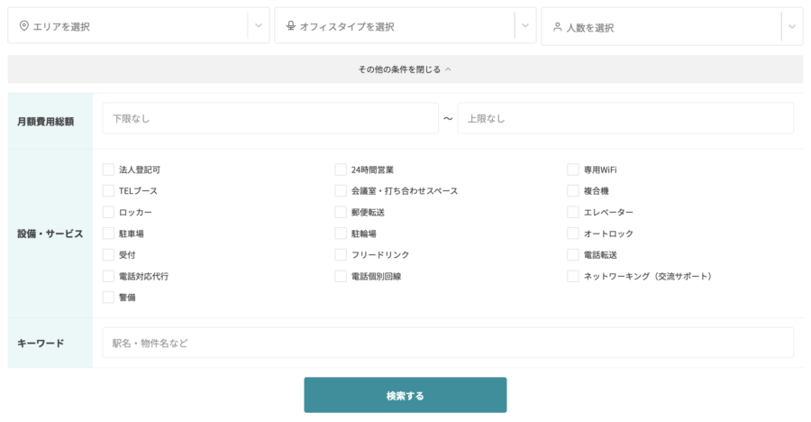 エリアや賃料帯はもちろん、「席数」「登記可」「会議室・個室の有無」など、多彩な検索フィルターを組み合わせて絞り込みが可能。