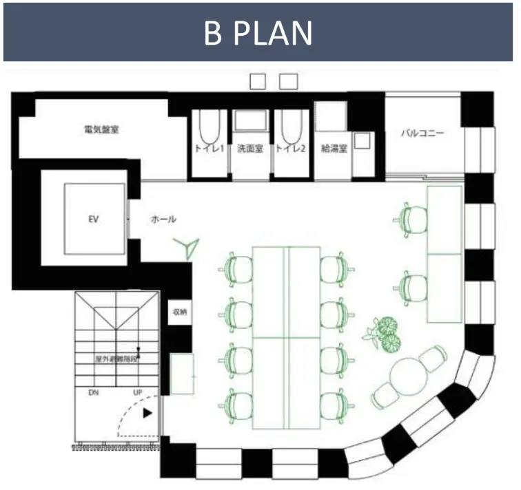 Bタイプは、10名分のワークデスクとチェアに加え、窓際にはハイテーブル1台とハイチェア2脚を備えたプラン。