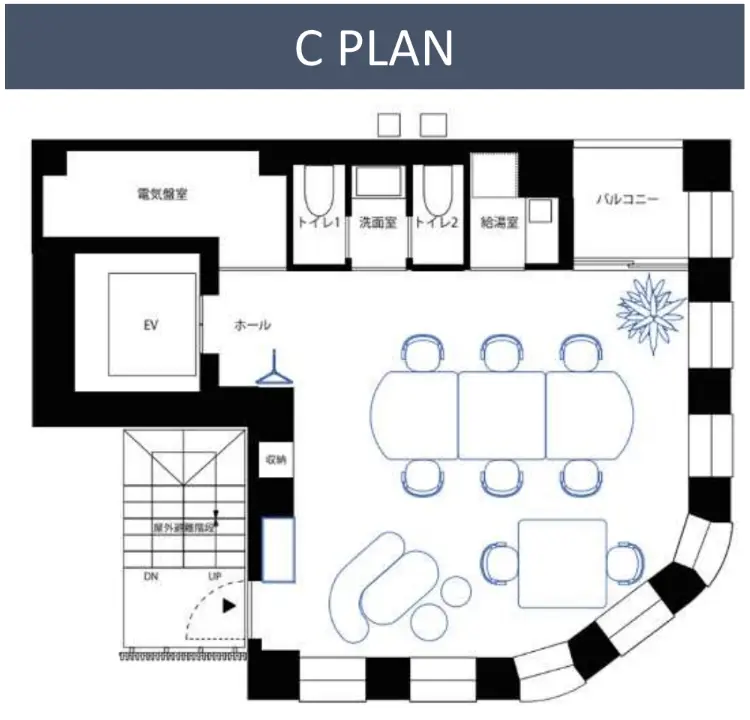 Cタイプは、8名用のワークデスクとチェアに加え、2人掛けのソファ、ラウンドテーブル、スツールを備えた構成。