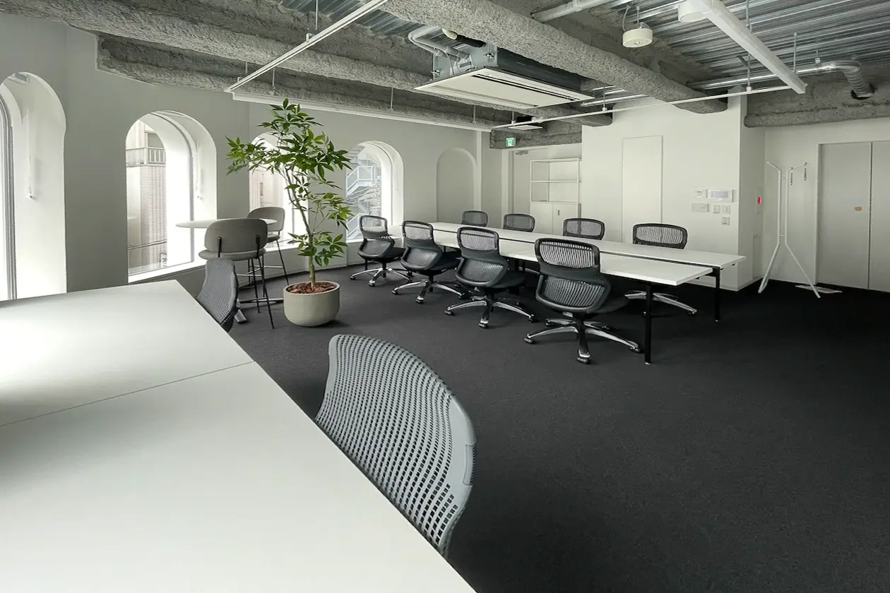 モノトーンで統一された家具が空間に調和し、落ち着きと機能性を兼ね備えたスタイリッシュなワークプレイスとなっています。