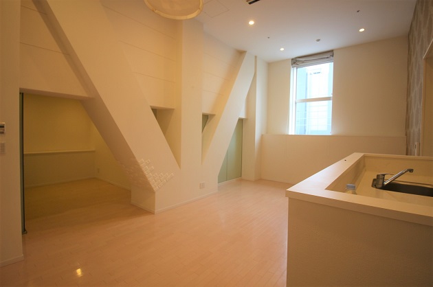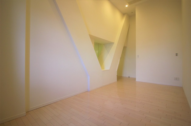 窓は小さいですが天井が非常に高く開放的な空間。斜めの柱が印象的でデザイン性を感じます。壁沿いに一部細長いカウンターもありうまく活用したいところです。