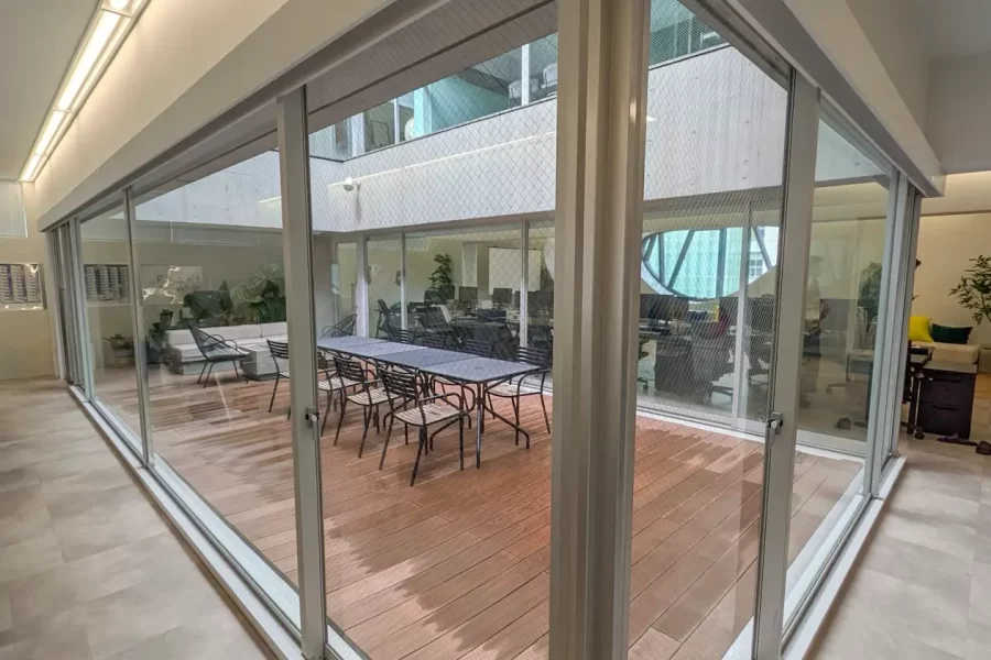 ガラス張りの造作は中央の吹き抜けと相まって開放感を演出。