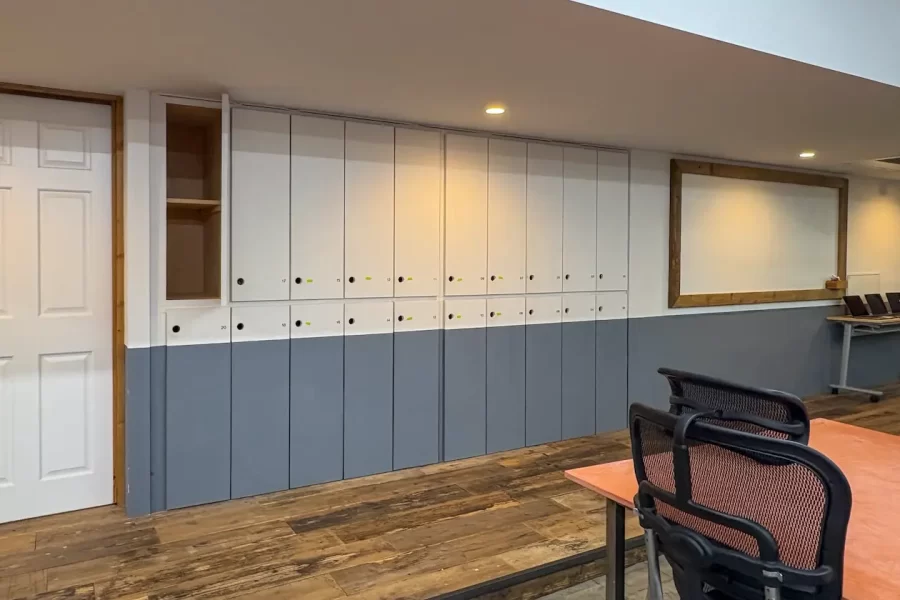 両端にはそれぞれソファーデスクと内装と調和するロッカーが造作されています。