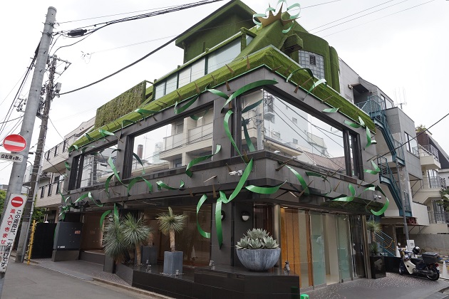 グリーンがテーマのような個性的な外観。