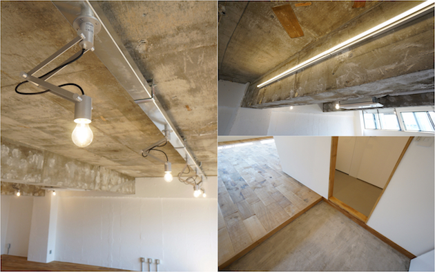 天井は躯体表しでヴィンテージ物件特有の荒々しさを表現、白塗装の壁面にする事で全体的にラフな方向に行き過ぎないようにバランスさせたデザインだ。