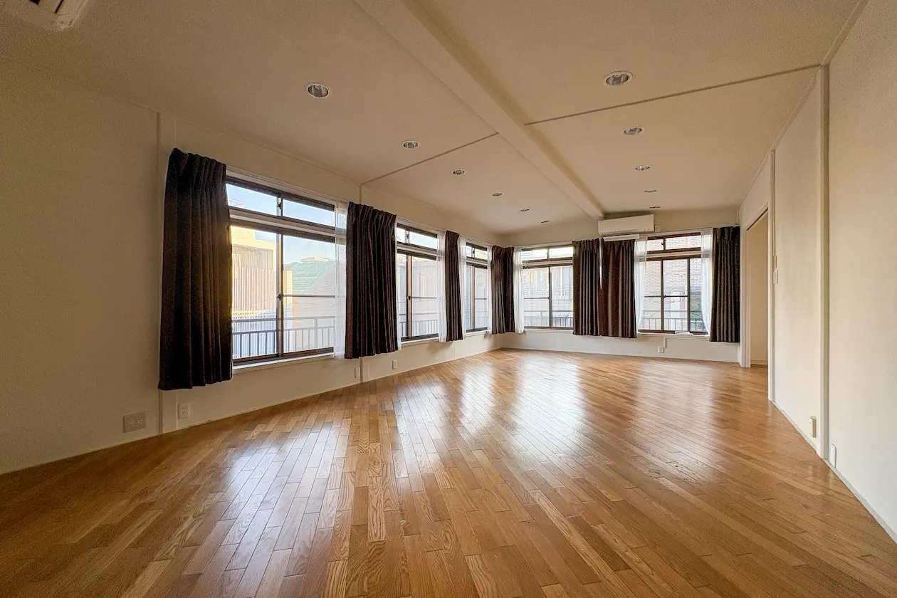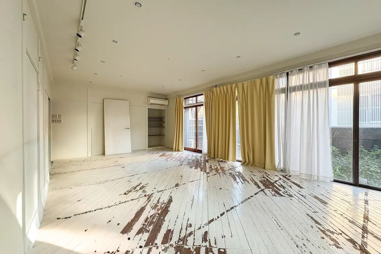 ↑ 室内原状回復中の写真です。(床塗り直し・壁修復後にお引き渡し)1階のメインスペースは、約14帖ほどのゆったりとした広さがあり、大きな掃き出し窓から自然光がふんだんに入る開放的な空間。