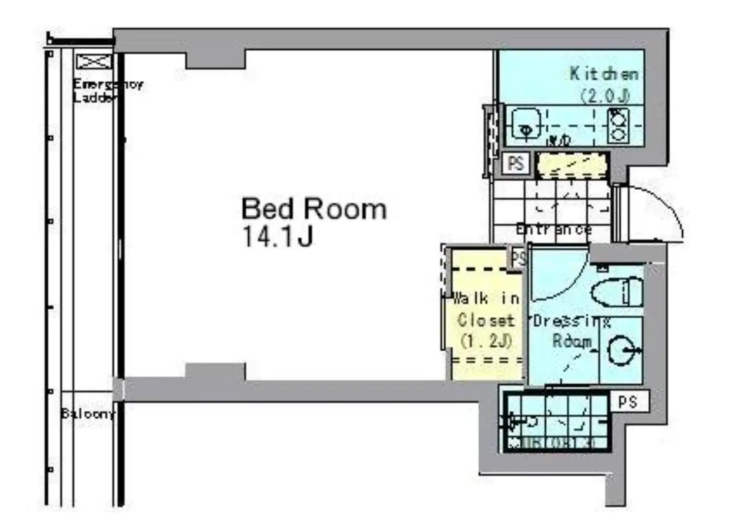 10.95坪のスタジオタイプは、約14.1帖のメインルームに加え、1.2帖のウォークインクローゼットを備えた機能的な間取り。ウォークインクローゼットは収納だけでなく、書類や機材を収める小さな倉庫スペースとしても活用可能です。