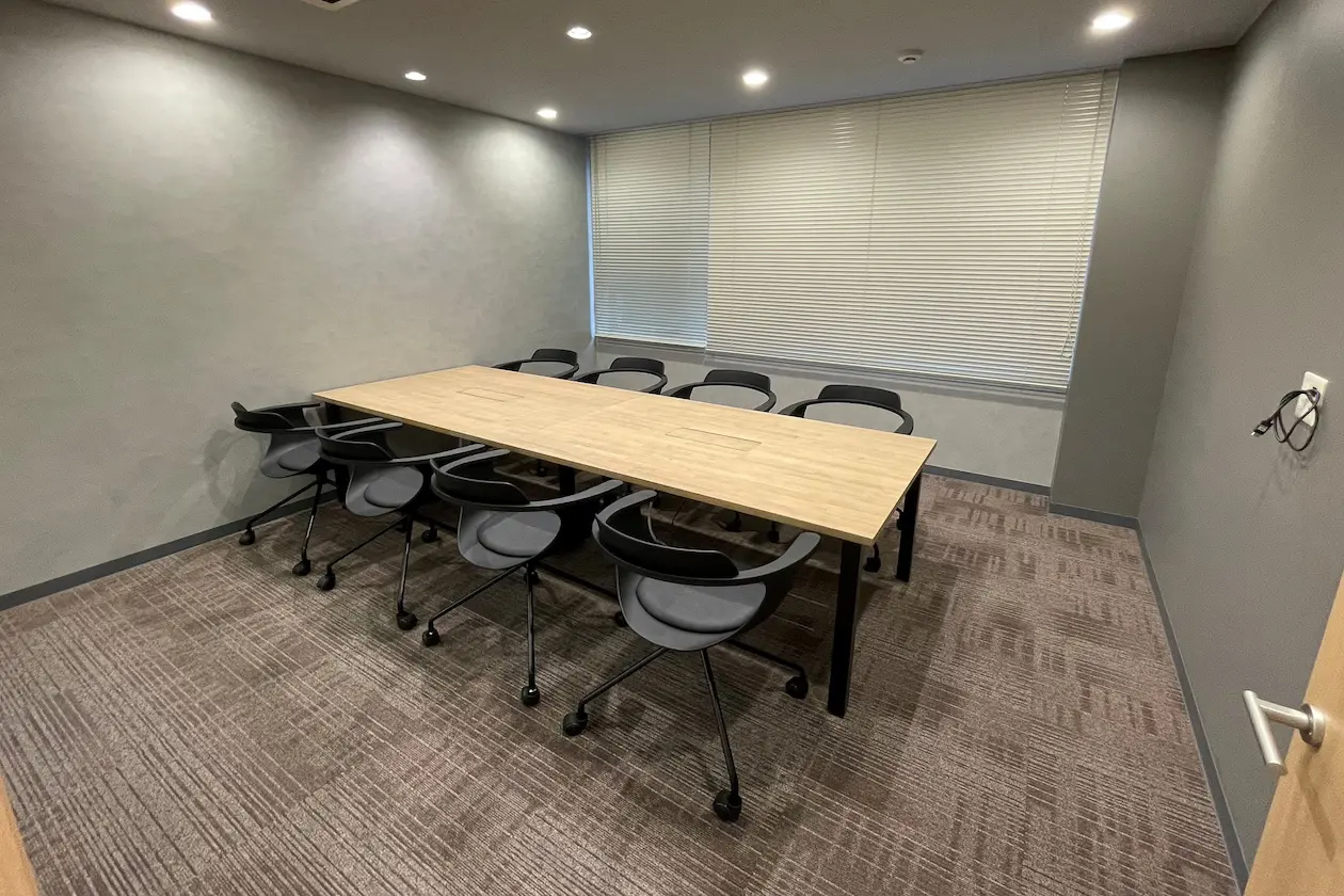 こちらは8名でご利用いただける会議室です。社内会議や来客対応など幅広い用途に対応できる空間です。