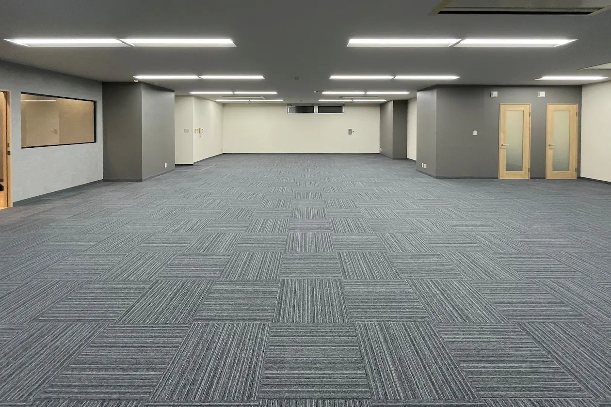 床は落ち着いたグレー系のタイルカーペットで統一され、視線が奥まで抜けるため、実際の面積以上に開放感を感じられます。