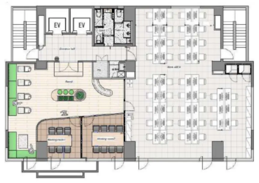 デスクを置いて30〜40名ほどでご利用いただけます。なお、執務室には什器、備品の設備がございませんので、ご注意ください。