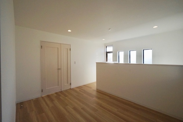 2階に上がった正面のお部屋です。スクエア型が斜めに連なる14帖ほどのお部屋。こちらもワークスペースやちょっとしたストレージとしても良さそうです。