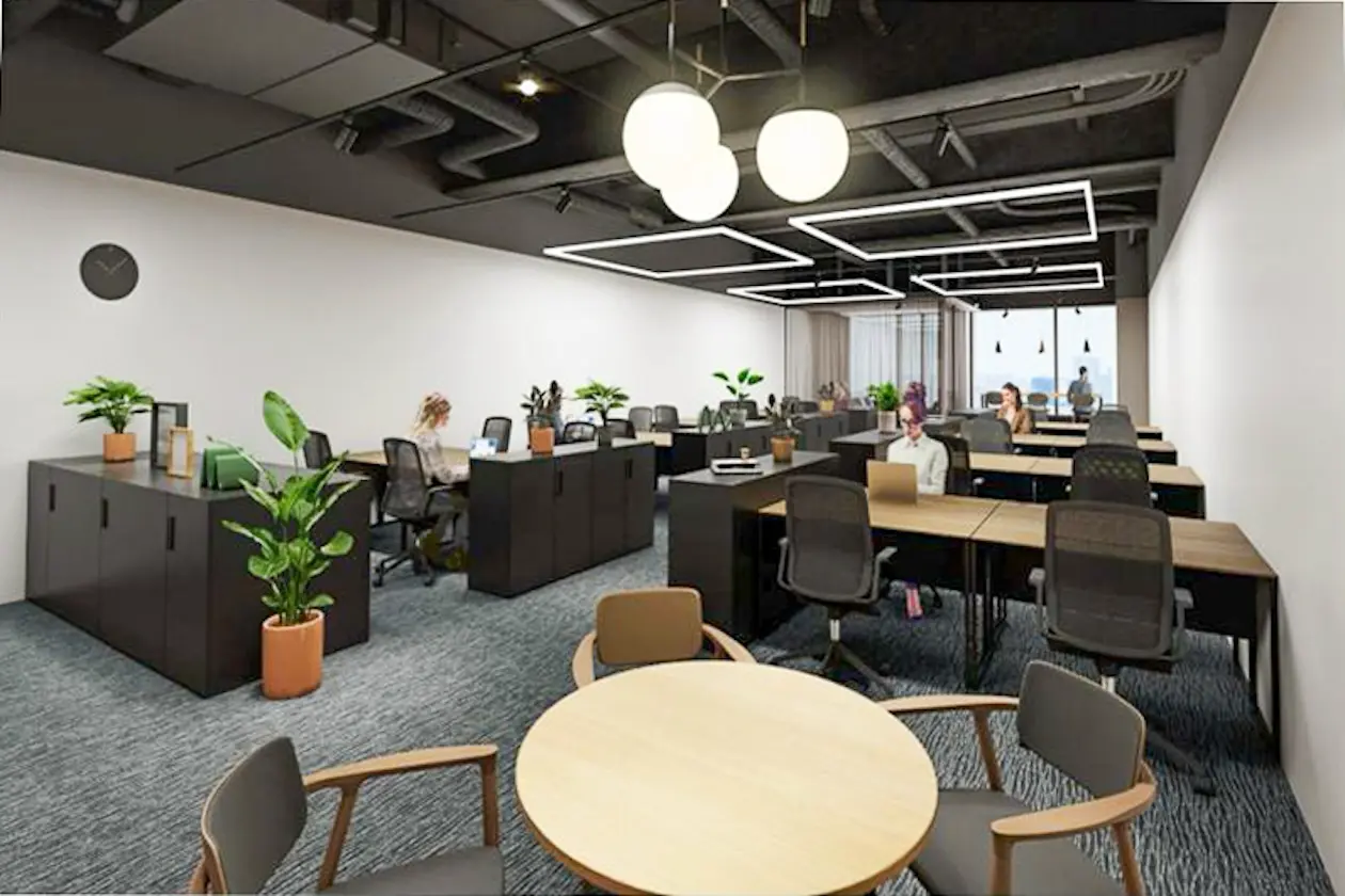 高層階の開放感と、ハーフセットアップの機能性を備えた、共有ラウンジ付きオフィス