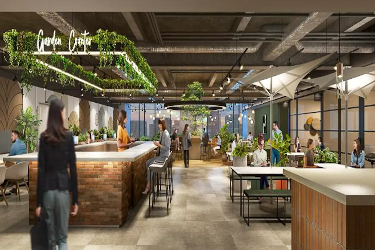天井を走る配管やダクトをあえて見せたインダストリアルな構成に、豊かなグリーンを組み合わせた共有ラウンジ。