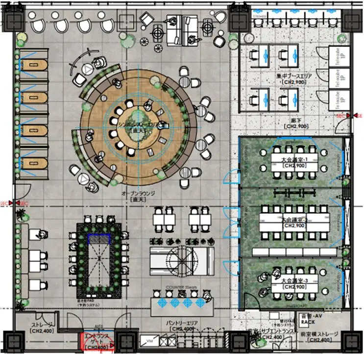中央には植栽を囲むようにレイアウトされたカウンターやテーブルが配置され、個人作業から軽い打ち合わせ、来客対応まで柔軟に対応可能。