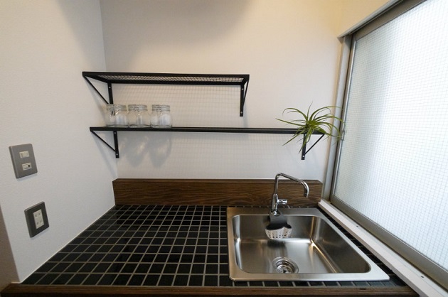 キッチンはコンパクトながらアイアンシェルフが2段ついていて、お茶や食器類をすっきり収納することができます。