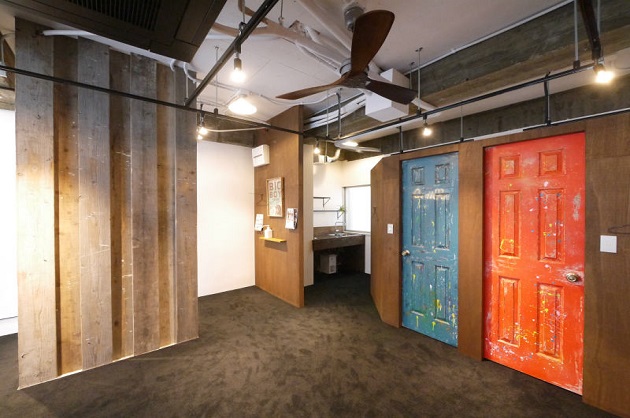 赤と青のドアの向こうは篭っての作業や、オンラインミーティングに最適な小さな個室となっています。