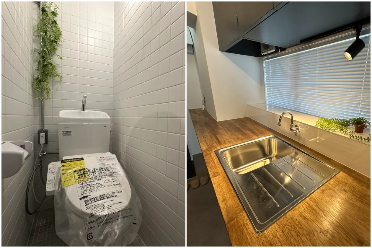水回りも清潔感があり、ケトルを置いたりできるスペースも備わっています。