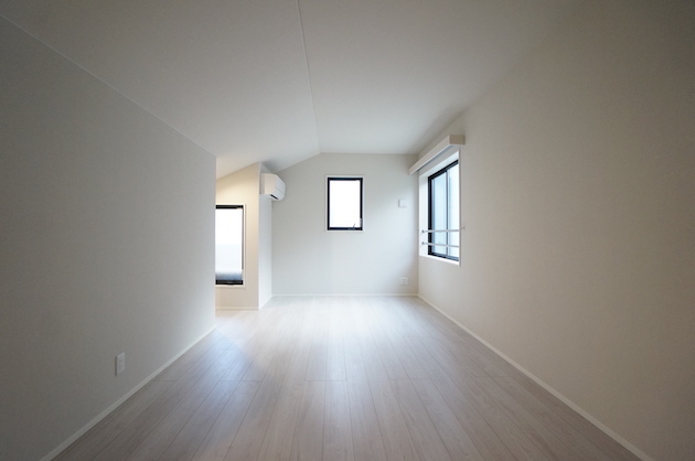こちらが3階の9帖のベッドルーム。最上階のため一部傾斜天井となっており、それを活かしたデザインが特徴的。