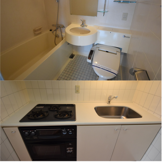 水周りはホテルライクなユニットバスタイプ。キッチンスペースはかなり広さがあり自炊する場合も充分に機能するでしょう。