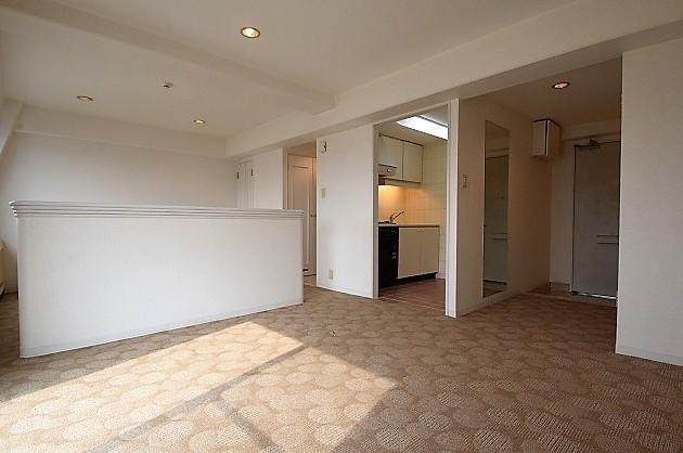 中央でゆるく仕切られたワンルームの室内は約40㎡。少数精鋭でお仕事をするにはちょうどよさそうなサイズ感。床はカーペットでお部屋角にコンパクトなクローゼットも付きます。
