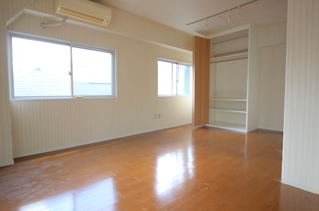 必要最低限のクローゼットがあり、L字型の室内の手前側にベッドを置くイメージも湧きました。