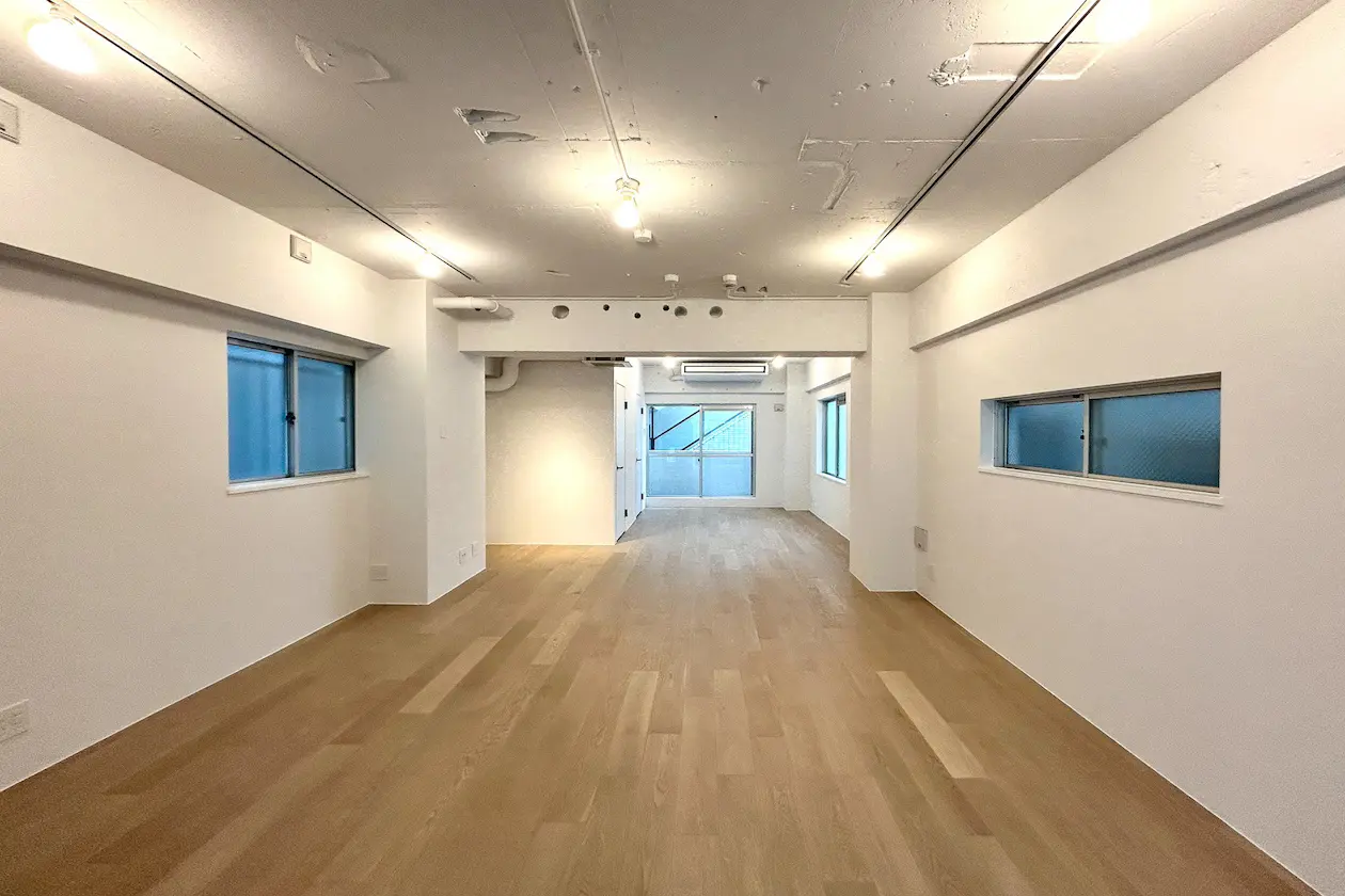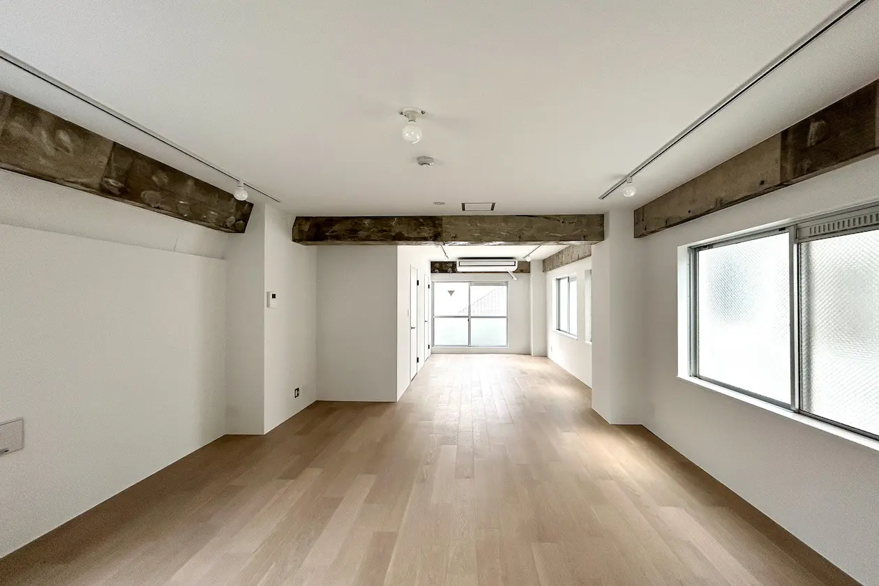 白塗装にクリーンな印象の木目調のフローリングは、ザ・リノベオフィスの魅力を醸し出している。