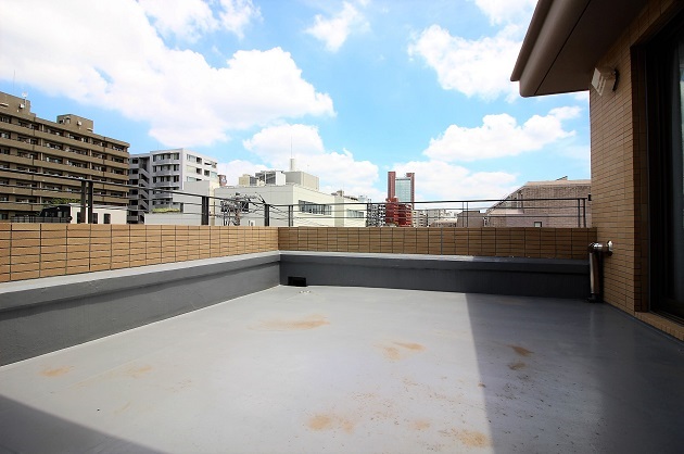 先ほどのお部屋と同じくらいの広さのルーフバルコニー。周囲は高層の建物がほとんどなく、陽の光を充分に浴びられる気持ちの良い空間です。ウッドデッキなどを敷いても映えそうです。