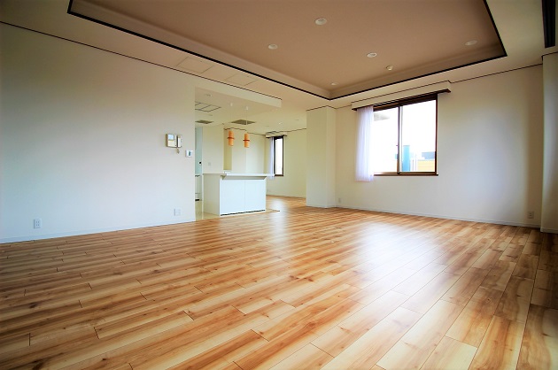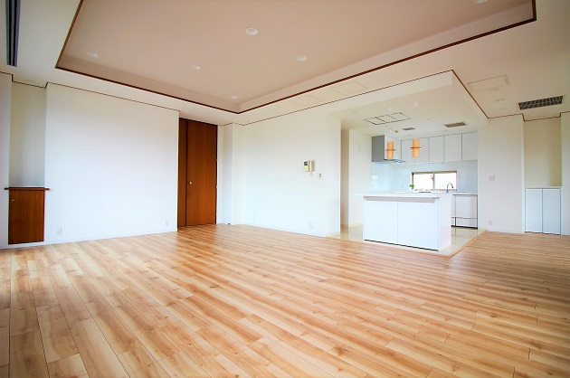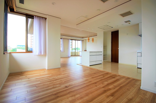 大理石の広々としたエントランスを抜けてすぐの最も広いLDKのお部屋。窓が多く配置されており採光も良好です。