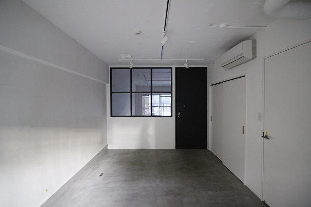 玄関入ってすぐの土間風のスペース。モルタル床であえてざっくり仕上げている空間。ある程度の広さが確保されているのでミーティングや応接としてスペース活用しても良さそうです。