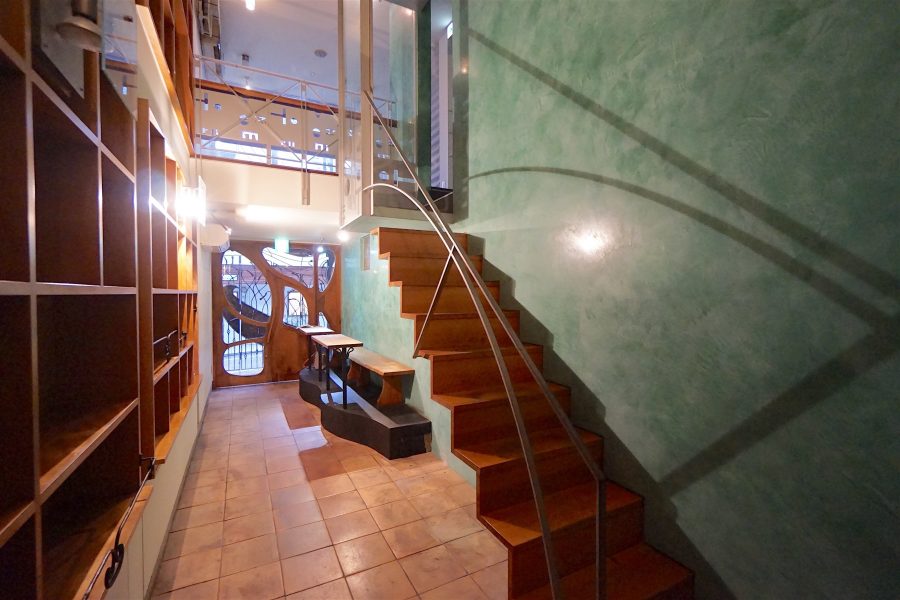 まるで図書館のような陳列棚と、吹き抜け天井、メゾネット階段。