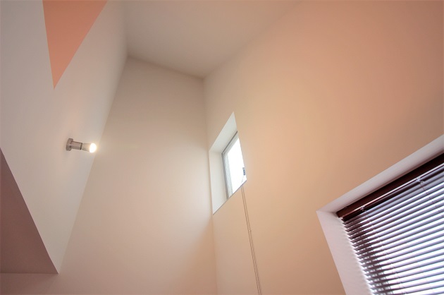 4階部分の8帖ほどの室内。傾斜になっている天井が印象的で、こちらの室内には多くの収納が取り付けられています。
