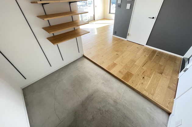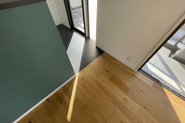 キッチンと仕切るように、異なる床材が使用されているためメリハリのある空間を実現。