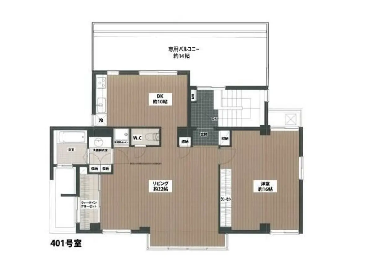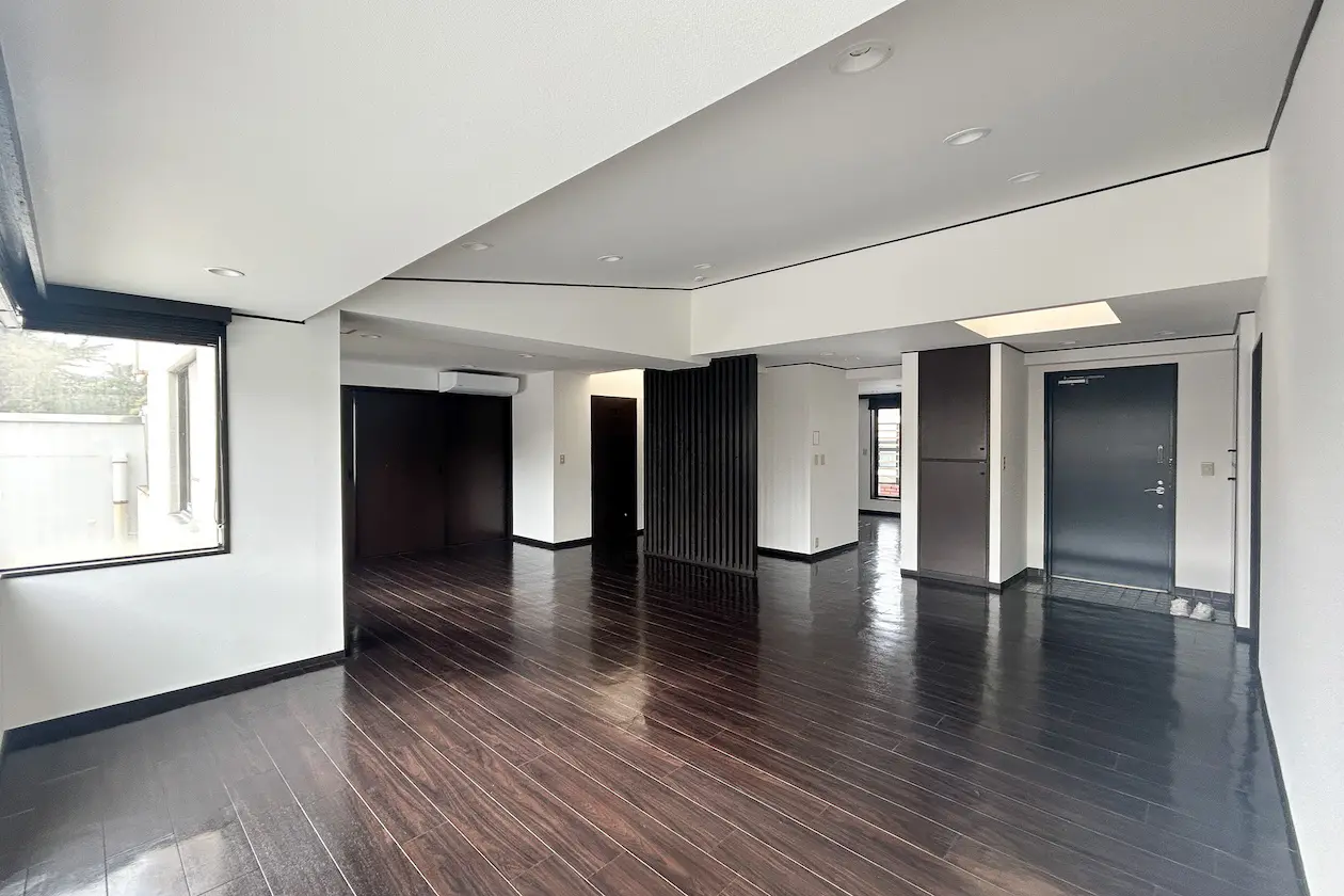 室内は87㎡の1LDKタイプ。ダークブラウンのフローリングと白壁のコントラストが印象的。