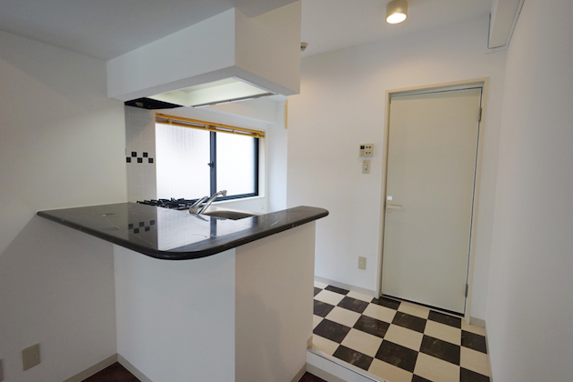 キッチンはモノクロのブロックチェックが印象的な清潔感のある空間となっています。