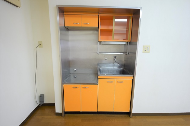 キッチンは、部屋の雰囲気を明るくしてくれるようなオレンジ色。コンロのないすっきりしたデザインはオフィスにあっても違和感を与えません。