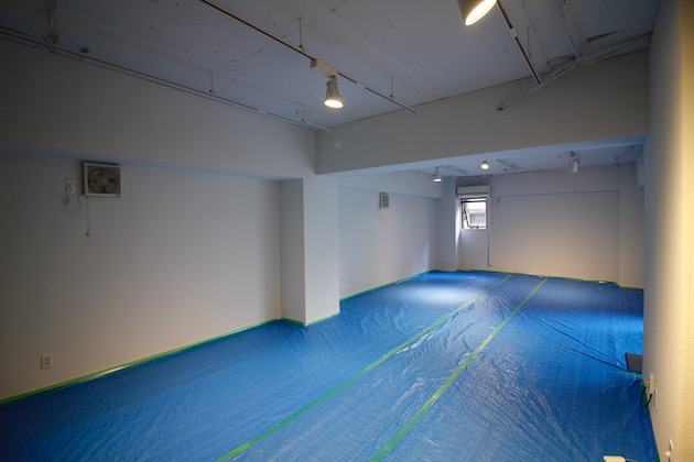 現在は原状回復のため床にブルーシートを敷いておりますが、グレーのタイルカーペット仕様になる予定です。