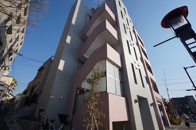 駅から出てすぐの道沿いに面した本物件。打ちっ放しコンクリートとピンクのタイルで彩られたファサードです。