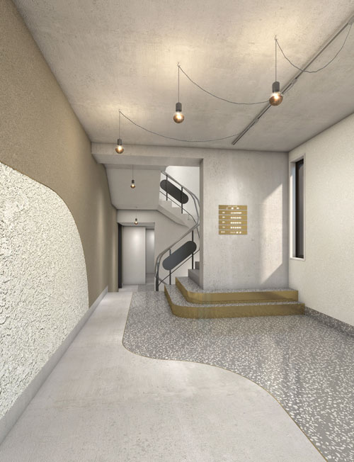 上の画像がこの階段を含めたエントランスのイメージとなります。