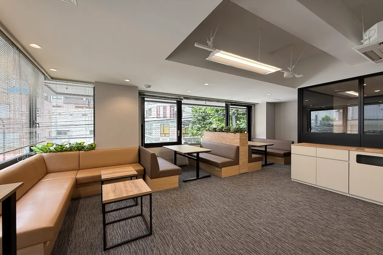 自然光が差し込む明るいラウンジスペースは、カジュアルなミーティングや休憩に最適な空間です。