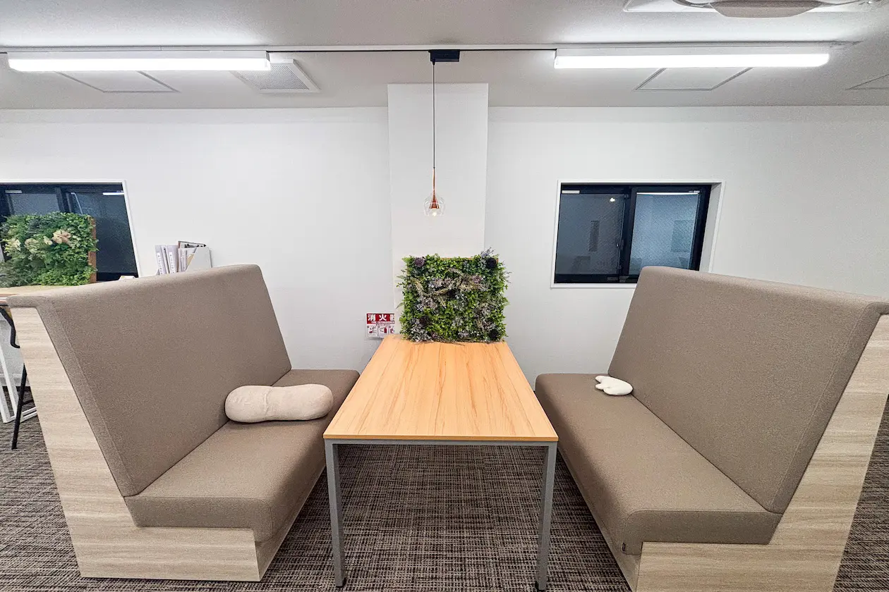 ワークスペースだけでなく4人がけのファミレスセットも設置。軽い打ち合わせやコミュニティスペースとしても活用できそうです。