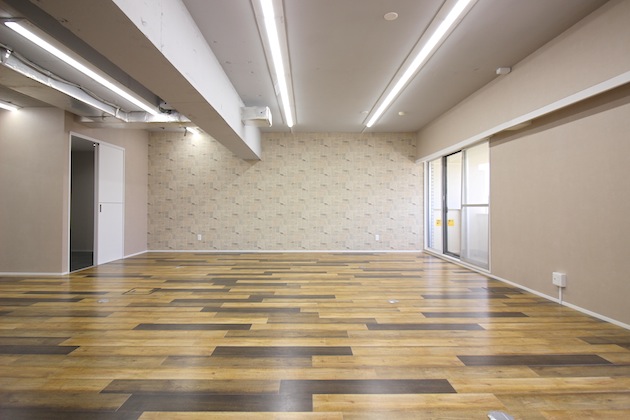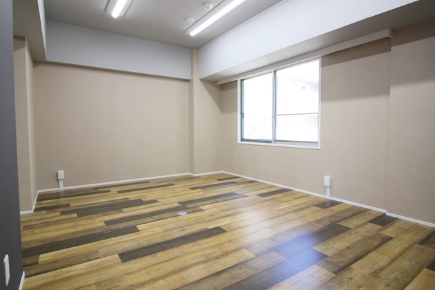 10名近くのデスクは十分に収まりそうです。床はフローリング調のフロアタイルを使用。