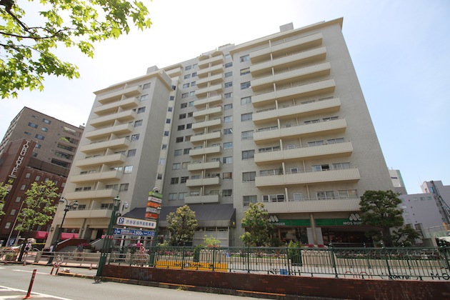 1975年築の重厚なマンションです。1階にはコンビニやファストフード店なども入居しています。