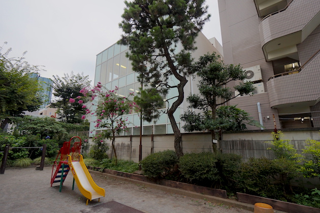 物件の脇にはコンパクトな公園があるビル同士が隣接しがちなこのエリアに於いて緩衝帯の役割も果たしている。