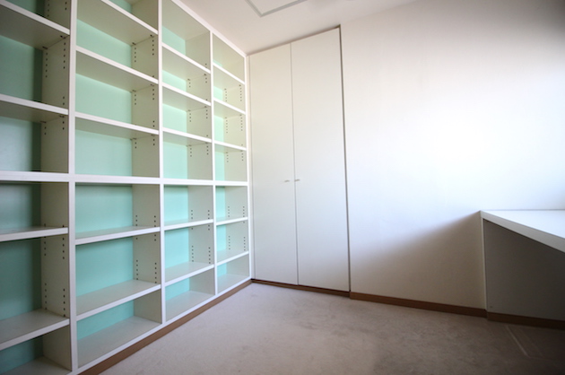 ミントブルーがアクセントのサービスルームは簡易デスク付きで、こちらも収納力は抜群です。