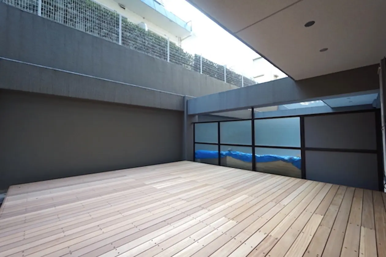 奥側には約34㎡のドライエリアとウッドデッキが備わり、従業員の休憩や打ち合わせ、リフレッシュスペースとして活用できます。