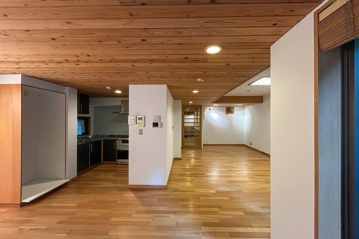 天井の木目、床の無垢材、掃き出し窓からの柔らかな自然光。室内にいながら森の近くにいるような、心がスッと整う広いリビングです。